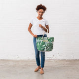 This custom personalized cotton canvas fabric tote bag is the perfect gift. It's leafy print is unique and chic, and its large proportions make it a "tote-ally" useful travel tote bag that will meet all your needs. This distinctive, printed cotton canvas tote bag features a snap magnet closure and soft dual rope handles.