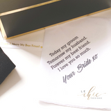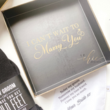 - One black and gold box as shown (To my groom and I can't wait to marry you on the interior)