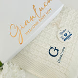 - One personalized blanket with monogram name-Blanket comes in pink, blue or cream (as shown)