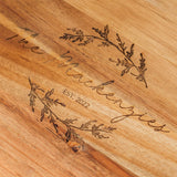 Customize the stylish rectangular cutting board with an engraved family name, a date, or other custom text to complete the design. Gift it to a newlywed couple, making it a thoughtful and special housewarming gift. Made of natural acacia wood, this rustic cutting board is durable but beautiful. Hand wash with mild soap only and apply mineral oil when needed.
