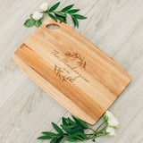 Customize the stylish rectangular cutting board with an engraved family name, a date, or other custom text to complete the design. Gift it to a newlywed couple, making it a thoughtful and special housewarming gift. Made of natural acacia wood, this rustic cutting board is durable but beautiful. Hand wash with mild soap only and apply mineral oil when needed.