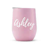 This personalized insulated stemless wine glass tumbler with lid is for more than just wine! Fill this stylish and trendy portable drinking mug with your favorite iced coffee or cold carbonated beverage while on the go. The plastic lid helps to keep your drink in place, and the thermal, insulated stainless-steel tumbler keeps your beverage at the right temperature. This drinkware is cute and custom, and makes a great gift when asking your favorite girls, will you be my bridesmaid? It is also a creative bridal party present that can be used while traveling to different venues on the wedding day, or novelty wedding favors for your guests that can be reused at many outdoor BBQs or social events in the future!