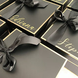 - One custom black & Gold box (8x8x4.5) including personalization, shredded paper & ribbon for closure