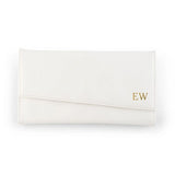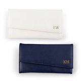 Keep your jewelery tidy and untangled with this large, personalized, faux leather travel jewelery organizer, perfect for tossing into your tote, carry-on, or luggage. It is designed with zipper pockets, open compartments, pouches, snaps, and straps for all your bits and bling, and includes a magnet closure. This beautiful pouch will keep your necklaces, earrings, watches, rings, and any other small trinkets or keepsakes safely stored. Personalize this travel jewelery organizer by adding up to 2 metallic gold initials to create a unique custom gift idea for your maid of honor, bridesmaids, and little flower girls, or for the mom of the bride and groom!