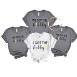 - Set includes-4 tees, 3 (we got the bubbly print (color to be chosen) and 1 WHITE "I got the hubby print")