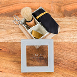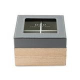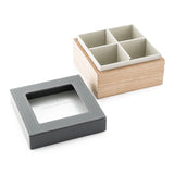 This attractive box features a wood veneer base paired with a grey faux leather and see-through glass cap lid. With four interior compartments this is a great box for organizing your smaller accessories.