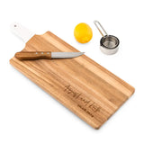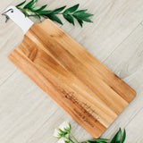 Customize the stylish rectangular cutting board with an engraved family name, a date, or other custom text to complete the design. Gift it to a newlywed couple, making it a thoughtful and special housewarming gift. Made of natural acacia wood, this rustic cutting board is durable but beautiful. Hand wash with mild soap only and apply mineral oil when needed.