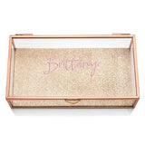 This elegant, rectangle shaped jewellery box is visually striking with its clear, glass panes set into a fine, rose gold frame, making it a beautiful storage spot for anything a woman might fancy. Whether they’re young girls or older ladies they’ll love using it to keep their rings, necklaces, bracelets and earrings luxuriously safe or as a drawer organizer for both small and unusual shaped dresser trinkets like hair accessories or safety pins. Not to mention that the box is perfect for decorative displays and can be made to look classic and modern, or antique and vintage depending on what decorations are placed inside. Personalize the jewellery box with a set of custom monogram initials, or a name, and you have the best idea for a unique gift that doubles as a memorable keepsake.